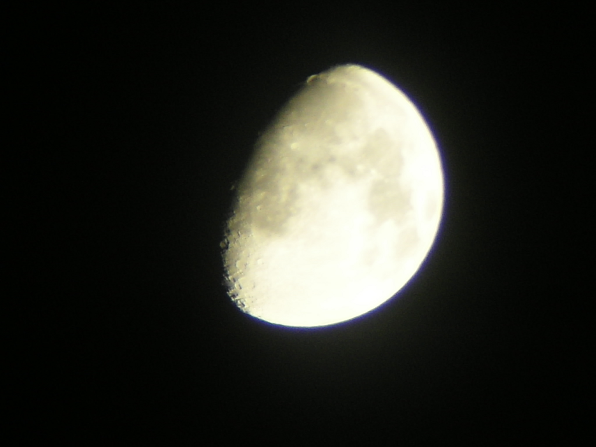 I noticed the Moon on my way home last night, and decided to experiment with the camera a bit more. The key tools here were (1) fixing a low ISO number (2) fixing the white balance (3) setting an exposure compensation of -2 (4) forcing spot, rather than "evaluate", metering (5) actually using digital zoom to evaluate the focus and brightness (6) leaning the camera against something steady (the truck dashboard.)