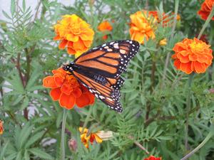 Walking around Concord Depot, saw this classic butterfly. I didn't get any good pictures of it in flight, it would hop to the next flower somewhat faster than my picture-taking-reaction time. It coordinates nicely with these particular flowers :-)